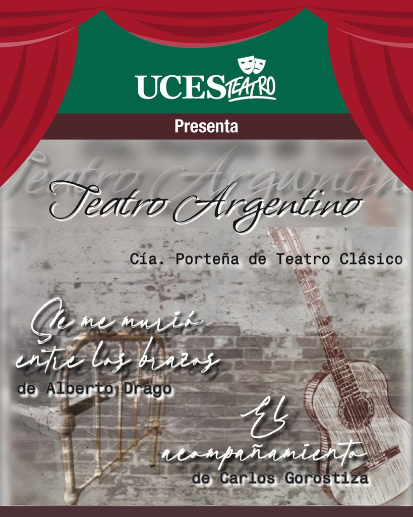 La Universidad de Ciencias Empresariales y Sociales tiene el agrado de invitar a los alumnos de los dos últimos años de vuestra institución como también al personal docente, a presenciar una función del espectáculo “TEATRO ARGENTINO” (SE ME MURIÓ ENTRE LOS BRAZOS de Alberto Drago y EL ACOMPAÑAMIENTO de Carlos Gorostiza) en el Auditorio Mayor de nuestra sede sito en la calle Paraguay 1338.